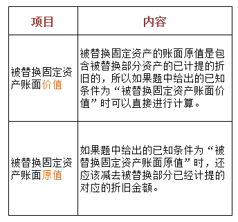 此类题目中常常出现已知条件为“被替换固定资产账面价值”和“被替换固定资产账面原值”,这两种已知条件的含义是不一样的。