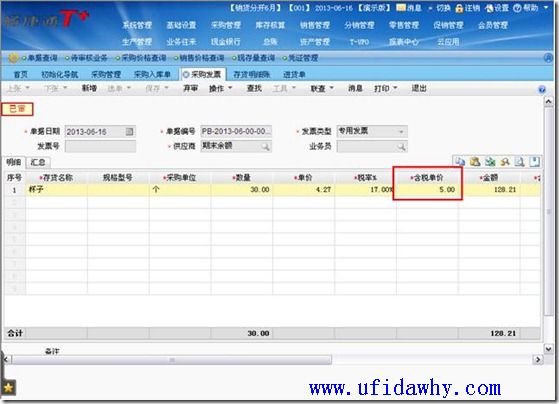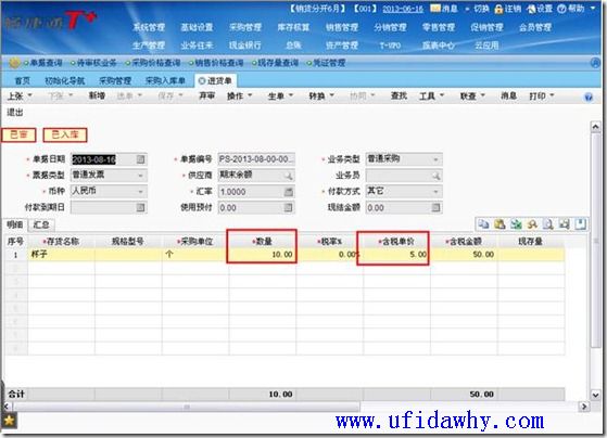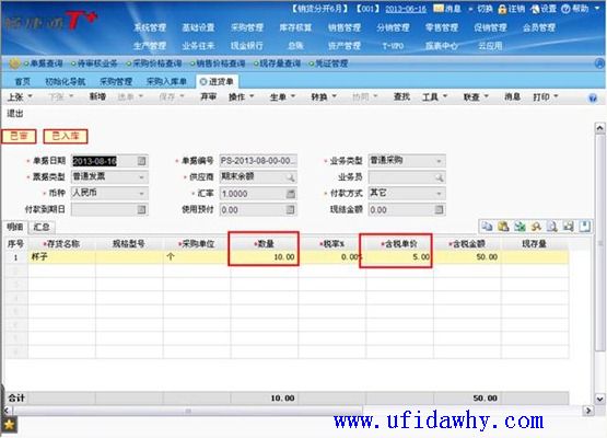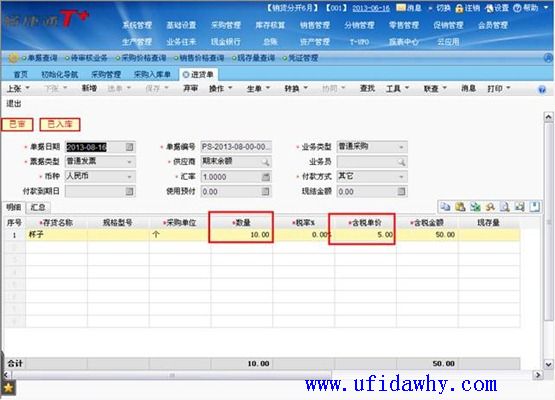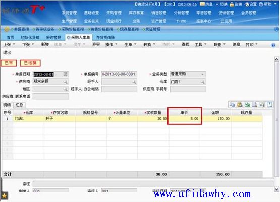 (2)8月16日填完采购发票/进货单审核以后,采购入库单上的单价会按照发票上的真实单价回填成5元,且会有“已核算”的标志