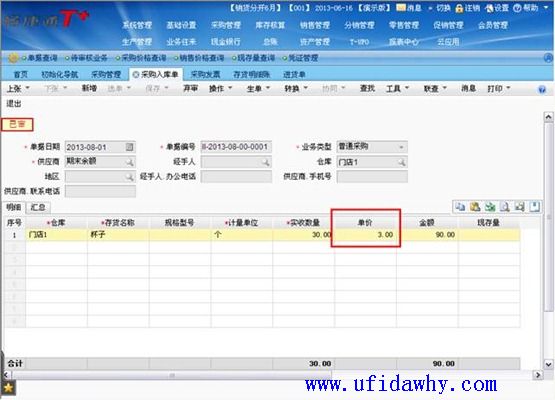 填写8月1日采购入库单,杯子30个,单价3元