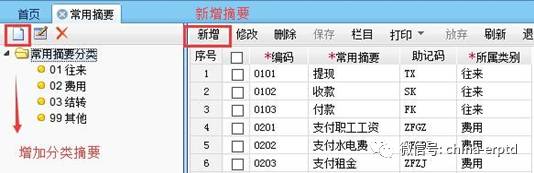 点击“基础设置”—“财务信息设置”—“常用摘要” 如下图,常用摘要可以分类来设置,左侧可以新增分类,右侧的【新增】用于增加常用摘要 设置好常用摘要,在填制凭证时就可以选择常用摘要。