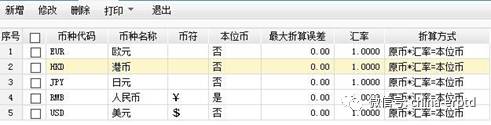 点击“基础设置”— “收付结算设置”— “币种”,系统预置了一些常见的币种,可以进行新增、修改或删除。