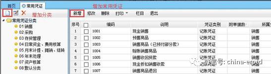 点击“基础设置”—“财务信息设置”—“常用凭证” 如下图,常用凭证可以分类来设置,左侧可以新增分类,右侧的【新增】用于增加常用凭证 设置好常用凭证,在填制凭证时就可以选择常用凭证,达到快速制单的目的。