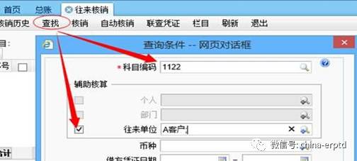 点击“总账”—“往来核销” 点击【查找】按钮,选择要核销的往来科目,可以选择相应的辅助核算信息