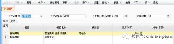 如下图,选择凭证类别,输入制单日期,附单据数,然后输入分录信息,最后点击【保存】按钮,如果是现金流相关凭证,会自动分配流量,且凭证上显示【已分配】