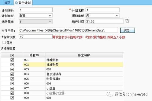 保留次数:建议写 10 天,因为软件的备份是覆盖式,0 表示不控制次数,再勾选需要备份的账套,保存即可