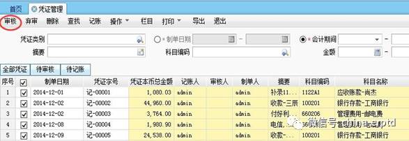 选择要审核的凭证,然后点击【审核】按钮即可。 取消审核即【弃审】注:在填制凭证界面也可以进行审核操作