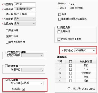 2、如下图,输入科目编码、科目名称,然后将“外币核算”选项打钩,并选择默认币种(一般为人民币),账页格式选择“外币金额式”。还可以设置期末是否调汇。