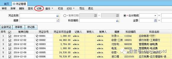 点击“总账”—“凭证”—“凭证管理”,选择过滤条件后确定点击【记账】按钮,提示记账完成注:较T3的改进是:记账之后的凭证在填制凭证界面仍然可以查看