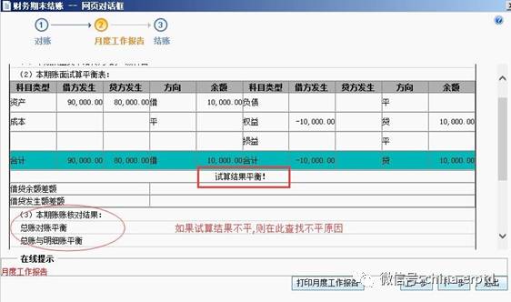 提示试算结果平衡,则可以正常结账,如显示不平,则到下拉菜单是查找不平原因,