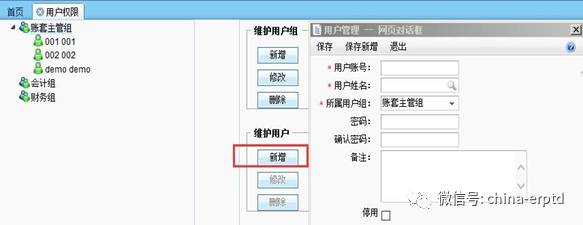 登录进来后,先建立相应的系统操作员,点击“系统管理”下拉菜单中的“用户权限”,只有财务应用,建议可以把其他操作员也设为【账套主管组】,输入相应对用户账号、姓名及密码即可,