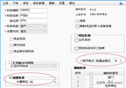 2、如下图,输入科目编码、科目名称,然后将“数量核算”选项打钩并选择一个计量单位,账页格式选择“数量金额式”,然后点击“保存”即可。