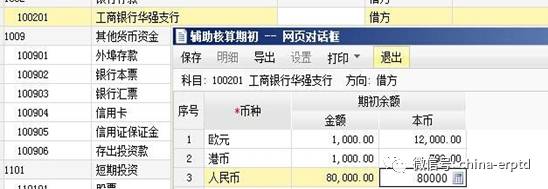 绿色行:辅助科目,双击录入辅助明细例:外币核算期初录入在外币科目行双击,弹出辅助核算期初界面,录入期初明细,然后保存即可外币明细: