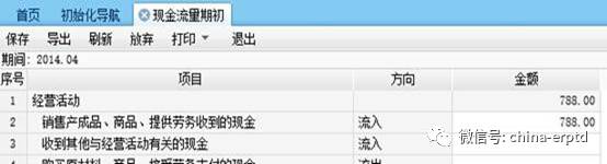 点击“系统管理”—“初始化”—“现金流量期初” 录入各现金流项目的期初金额即可