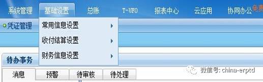 基础设置位于主菜单的【基础设置】下拉中,包括“常用信息”“收付结算”“财务信息”